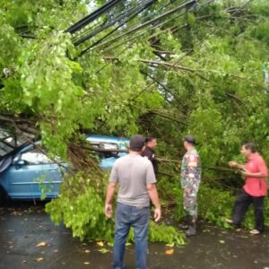 Pohon berukuran besar yang berada di tepi jalan tiba-tiba roboh saat hujan deras mengguyur kawasan tersebut. Dalam hitungan detik, batang pohon yang tumbang menimpa dua unit mobil yang sedang berada di lokasi. Selain itu, sebagian bangunan di sekitar titik kejadian juga ikut terdampak sehingga mengalami kerusakan cukup parah.